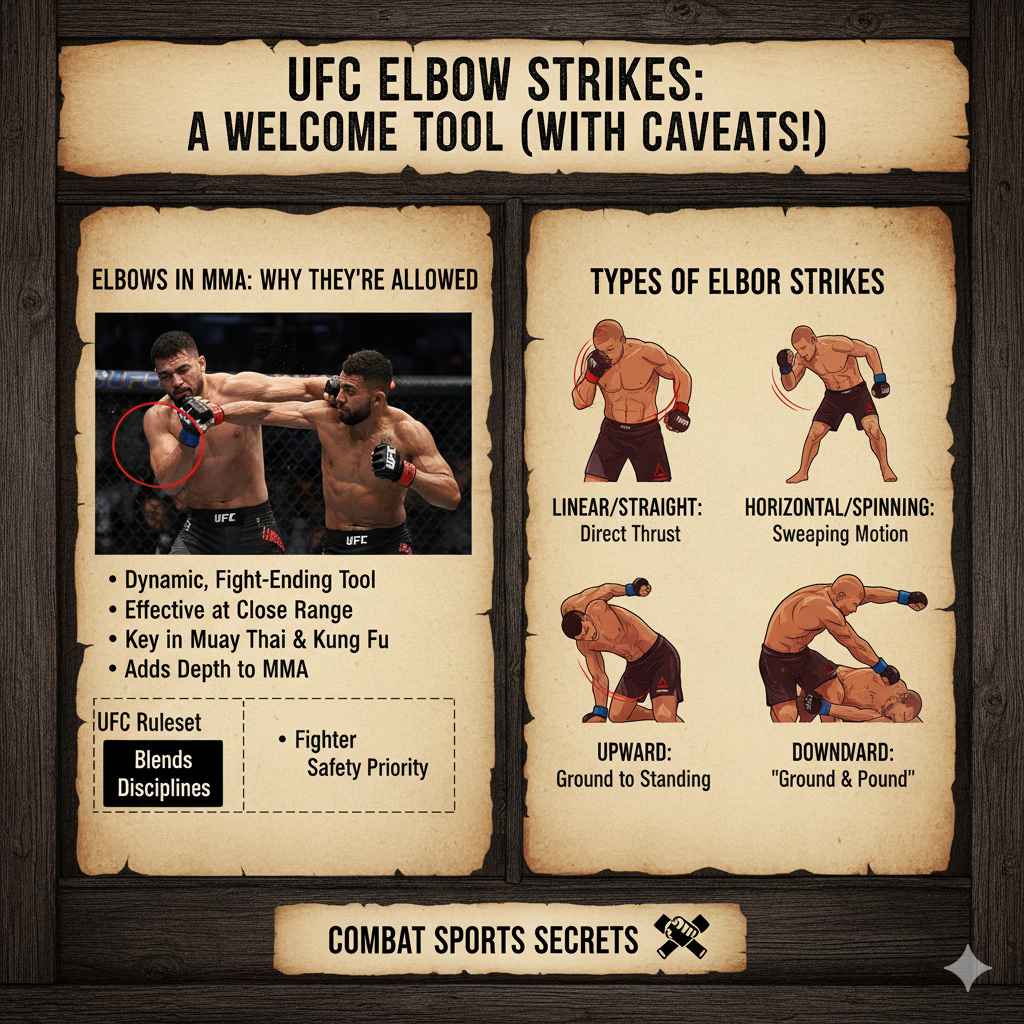 Yes, elbows are a legal and important weapon in UFC, but they come with specific rules to ensure fighter safety and fair play. You can strike with the point of the elbow, but using the point or tip is prohibited.